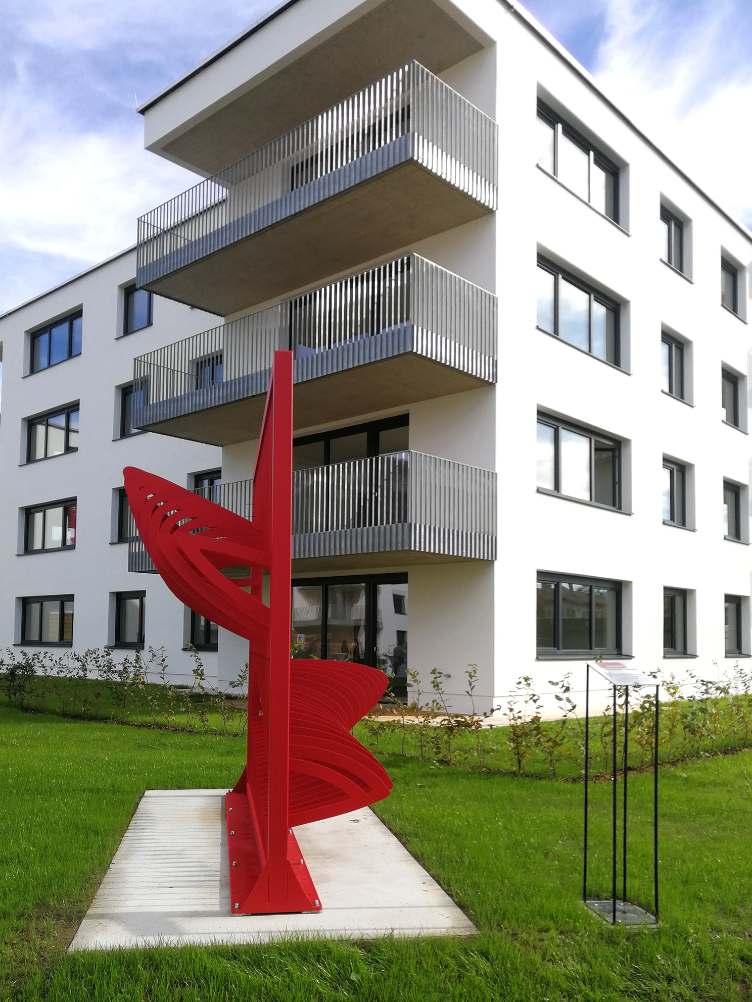 To intensify the visual play with the architecture Curtain Lighter is colored in red. In addition, the sculpture will be illuminated with red light and also intensify the place in the evening.