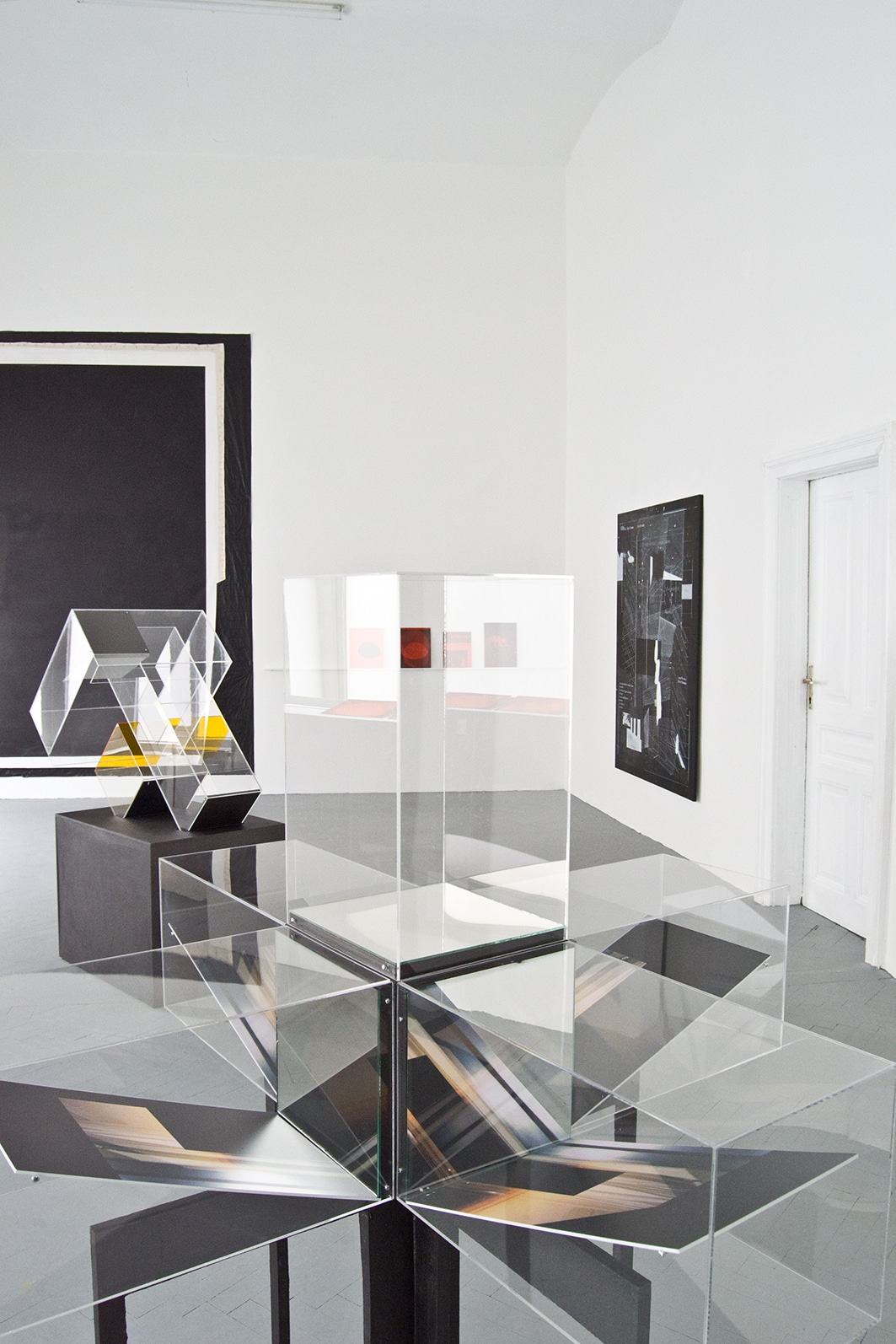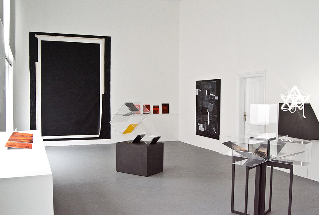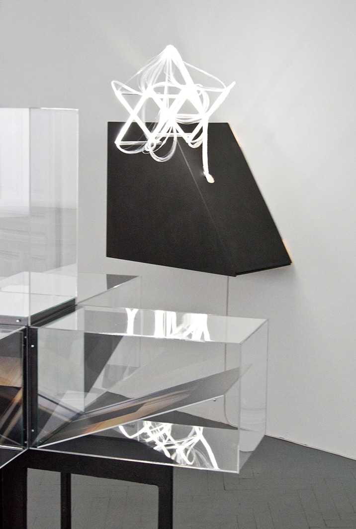 At first glance, it would appear that the artists Gregor Eldarb and Friedrich Biedermann do not have too much in common. Where Eldarb’s constructivist pictures draw on the formal repertoire developed by modernism, Biedermann’s work revolves around the topic of light, which he analyzes by means of filters, refractors and mirrors. One thing, however, that these very different artists do in fact share is a passionate interest in space. Austerely abstract and geometrical though they may seem, on closer inspection Eldarb’s drawings reveal a strongly performative approach: the spaces he designs provide an environment for the human body, and his lines need to be read as the traces of human movement. With the plexiglass cases created by Biedermann, vectorial partition, which literally cuts through the surrounding space, plays a much larger role than it does for Eldarb. Biedermann’s aesthetics are grounded in a highly conceptual method, as can be seen for instance in his sculpture Cold, where the titular word unfolds inside the sculpture through a series of mirrorings. Incidentally, a penchant for incorporating linguistic elements in their works is another thing the two artists have in common, since in Eldarb’s pictures, too, language plays an important part, mostly in the form of poetic fragments, abstract puns and experimental narratives. Speaking of narratives: Biedermann’s The End, which makes playful reference to the number of frames per second in movies, aims to ring in the end of conventional narrative.