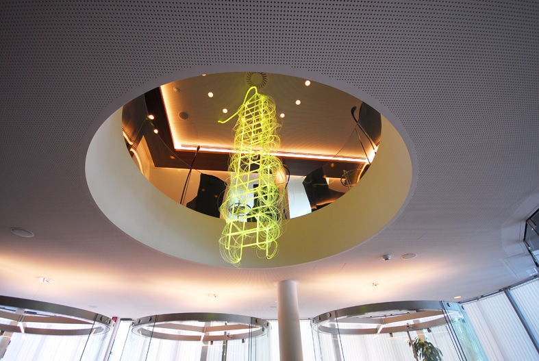 “Approach” embodies itself”, explains the artist. “It makes people think in new dimensions.” The work completes the entrance area in a very positive way. The work is made out of acrylic-tubes, which create the meaning of approach. Special light-fibres go through the tubes. The plait builds points of lights in the edges. The whole construction is pulsating and changes between the lights white and yellow. The projector is hidden within the ceiling and does not disturb. An in advance regulated programme switches between the lights. So Approach becomes a pulsating centre of light.