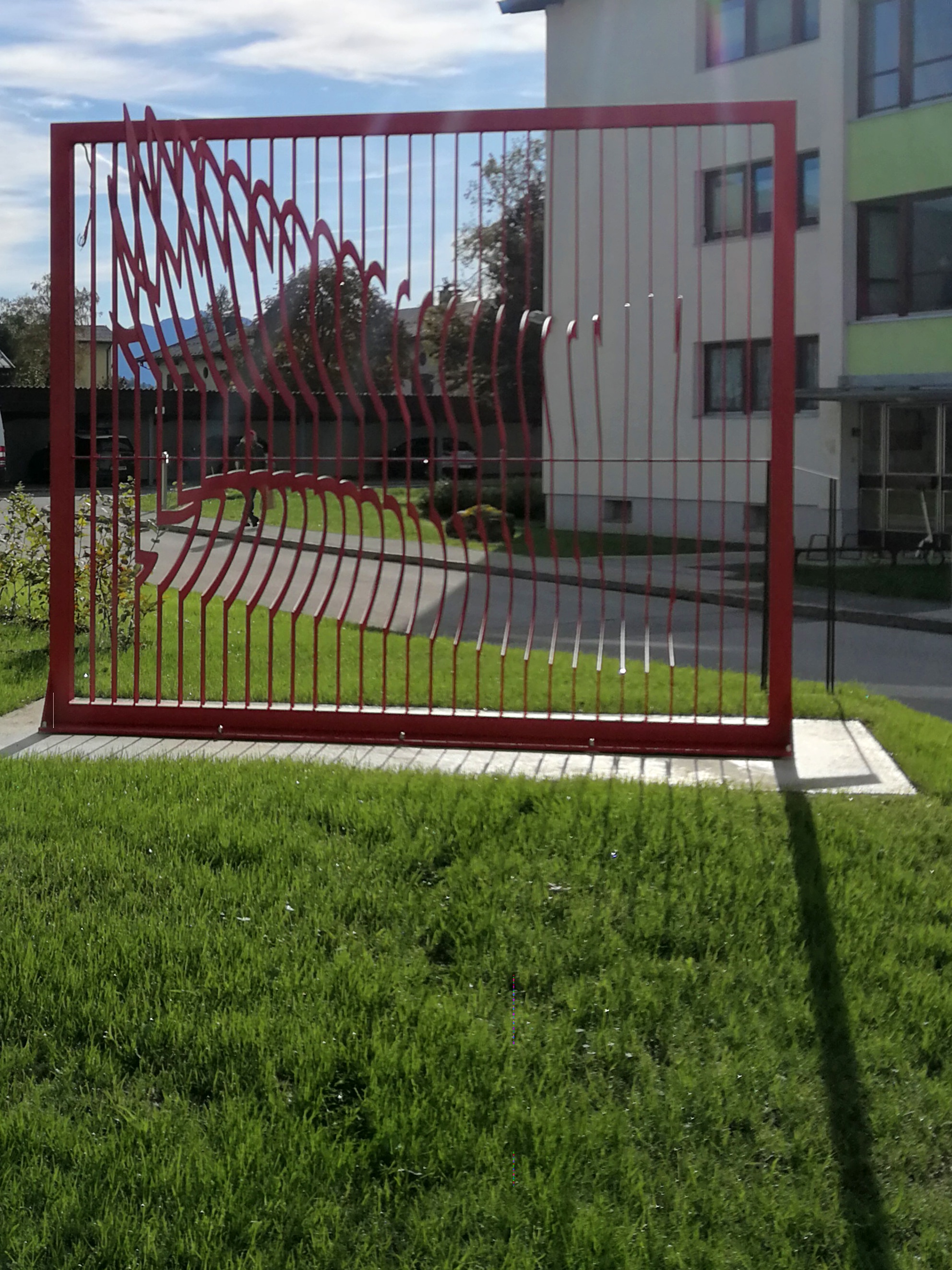 The sculpture stands on the concrete base and forms a wall of ribbons. The analogy to a curtain is intentional. Imprints are visible that change the curtain and create space. The linear structure is broken by amorphous forms. It creates an open space. These become stronger or weaker depending on the change of the visual axis on the sculpture. These are impressions of pillows that play in connection with the term New Home. Terms such as security, space, exchange, pressure, dialogue, were thought in Curtain Lighter.