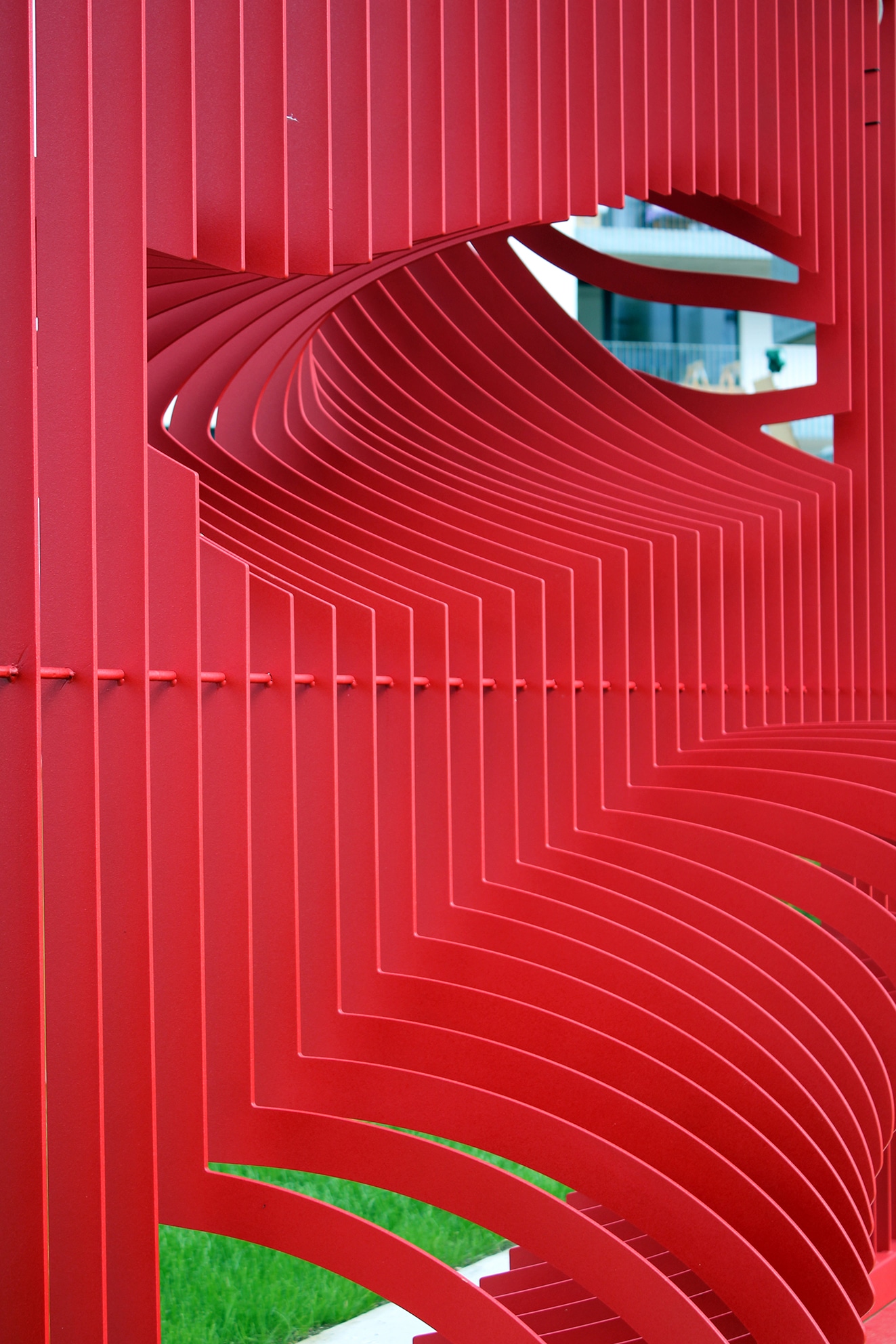 To intensify the visual play with the architecture Curtain Lighter is colored in red. In addition, the sculpture will be illuminated with red light and also intensify the place in the evening.