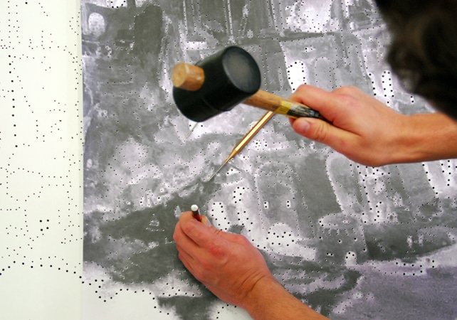Der Ausgangspunkt für die Programmierung dieser Lochstreifen ist eine direkte Übersetzung des Bildes “der große Turmbau” (1563) von Pieter Breughel dem Älteren.Im Jahr 1725 entwickelte der französischen Erfinder Basile Bouchon die Technologie der Lochstreifen. Er „programmierte“ mittels Lochkarten Muster auf Webstühlen. Ohne sie physisch umbauen zu müssen, variiert das Resultat. Dies ist auch ein wesentliches Moment des Computers. Biedermann dreht das Repräsentationsverhältnis der ersten Lochkarten allerdings auf den Kopf. Das Bild ist die Ausgangsbasis für die klangvollen Töne.