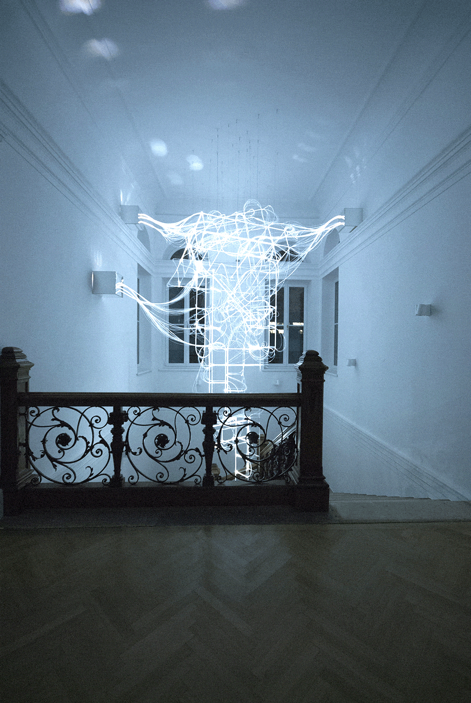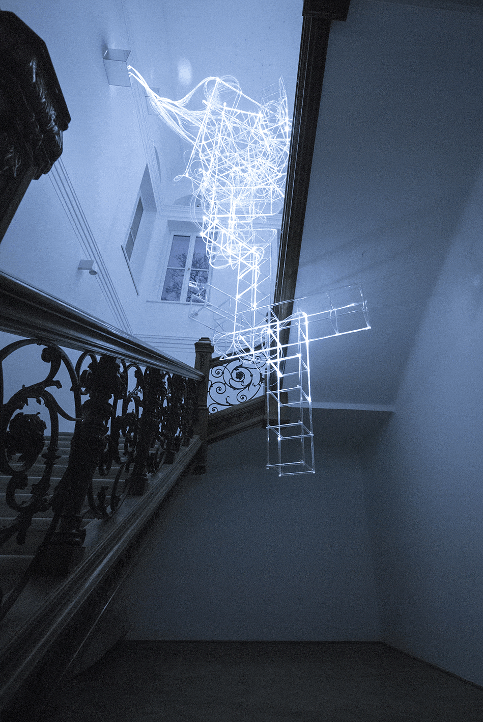 The text fragments consisting of transparent acrylic tubes are hung in the room and linked with light fibers (1mm diameter). The braiding causes points of light to appear at the corners of the letters, thus forming the significant glow of the work. The glass fibers are controlled by projectors. Using ZigBee (NeoLink Air) control, the light of the entire sculpture changes. To mimic natural light, Pi-LED technology is used as the light source. The projectors hang on the wall.