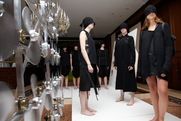 Mit der „darkmatter-Linie“ haben sich die beiden italienischen Modedesignerinnen Maria de Ambrogio und Stella Tosco innerhalb kürzester Zeit einen internationalen Ruf geschaffen. Seit 2009 entwerfen sie erfolgreich Strickmodelle und Lederaccessoires in Verbindung mit traditioneller Handwerkskunst und neuesten Technologien. Die stark reduzierten und statisch wirkenden Modeschöpfungen bildeten in dieser Kunstinstallation von Friedrich Biedermann einen stimmigen Kontrast.