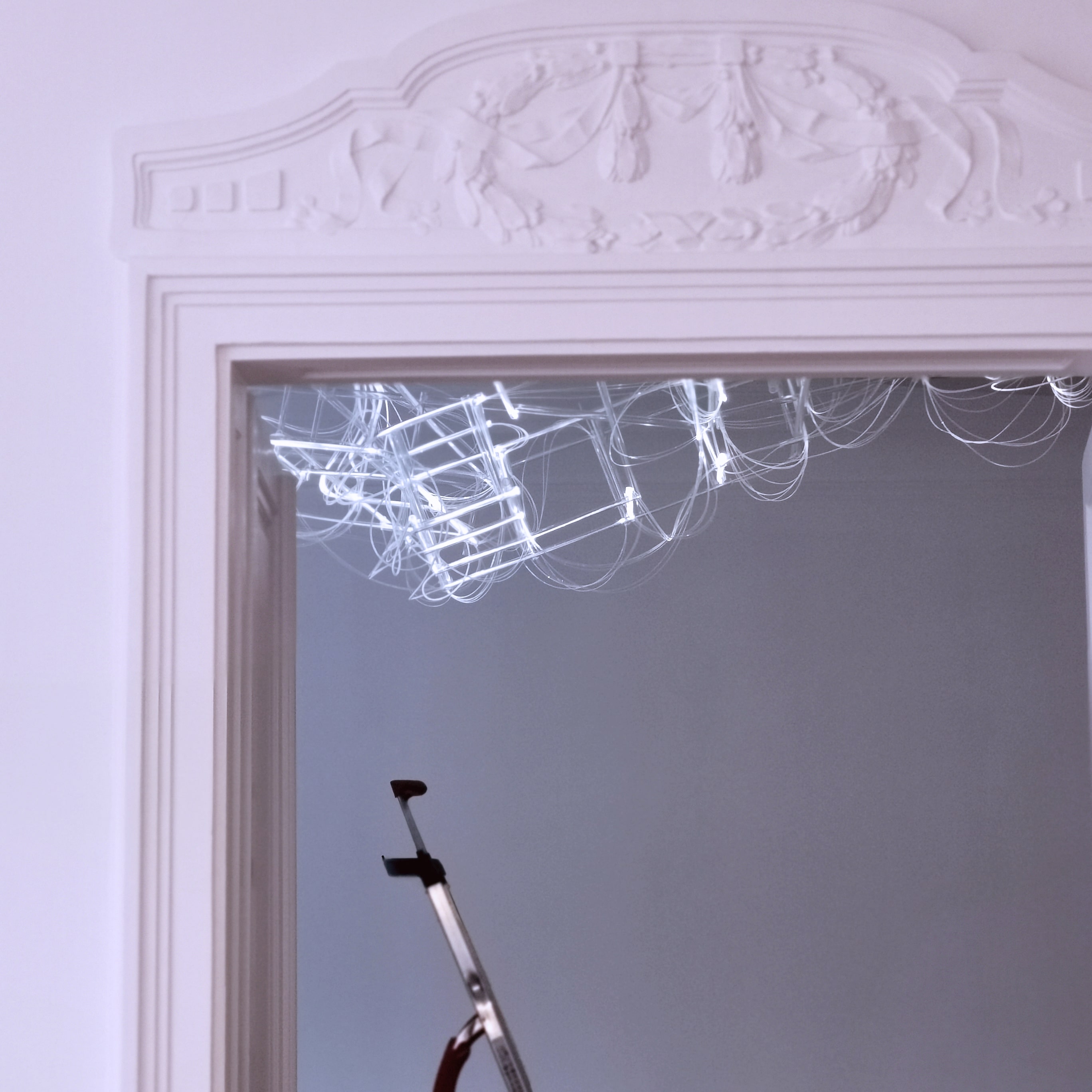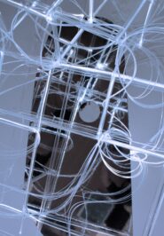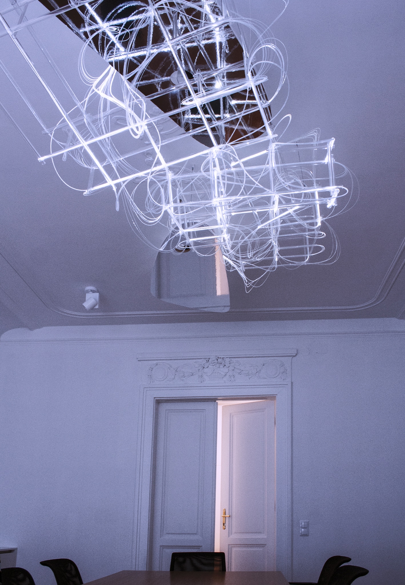 SB Lighttwiller is installed in the S + B Group’s Vienna office. The engagement with sculpture and the artistic approach to make an installation in the conference room, was a central starting point for the client. The sculpture hangs from the ceiling and shines with two different light colors. The constructive part consists of two letters that are braided together with fibers. The reflection creates an infinite space that includes the viewer. SB Lighttwiller is a work from the Suncloud series. It is a dialogue of materials, a filter of speed and time.