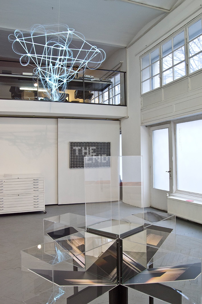 At first glance, it would appear that the artists Gregor Eldarb and Friedrich Biedermann do not have too much in common. Where Eldarb’s constructivist pictures draw on the formal repertoire developed by modernism, Biedermann’s work revolves around the topic of light, which he analyzes by means of filters, refractors and mirrors. One thing, however, that these very different artists do in fact share is a passionate interest in space. Austerely abstract and geometrical though they may seem, on closer inspection Eldarb’s drawings reveal a strongly performative approach: the spaces he designs provide an environment for the human body, and his lines need to be read as the traces of human movement. With the plexiglass cases created by Biedermann, vectorial partition, which literally cuts through the surrounding space, plays a much larger role than it does for Eldarb. Biedermann’s aesthetics are grounded in a highly conceptual method, as can be seen for instance in his sculpture Cold, where the titular word unfolds inside the sculpture through a series of mirrorings. Incidentally, a penchant for incorporating linguistic elements in their works is another thing the two artists have in common, since in Eldarb’s pictures, too, language plays an important part, mostly in the form of poetic fragments, abstract puns and experimental narratives. Speaking of narratives: Biedermann’s The End, which makes playful reference to the number of frames per second in movies, aims to ring in the end of conventional narrative.