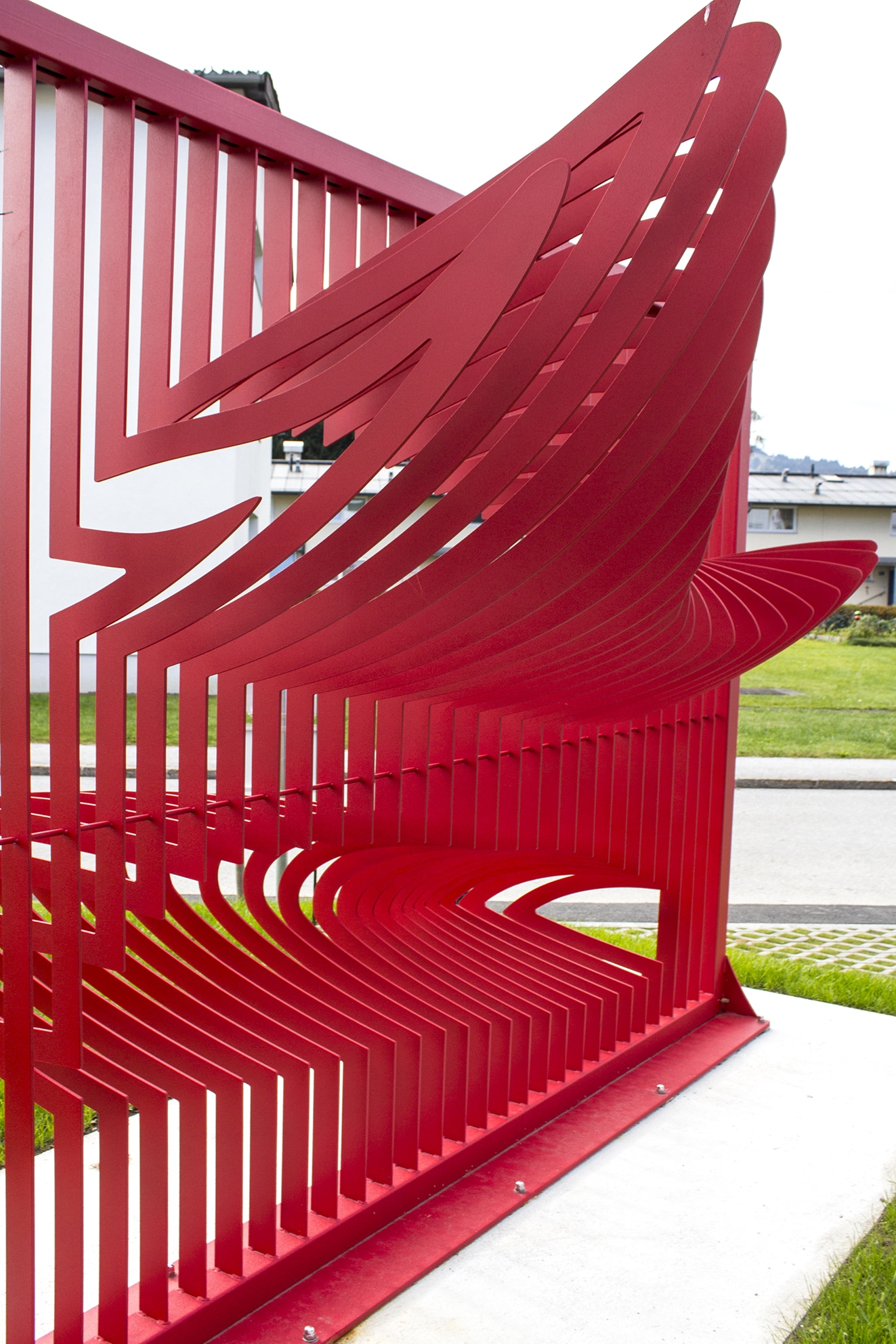 To intensify the visual play with the architecture Curtain Lighter is colored in red. In addition, the sculpture will be illuminated with red light and also intensify the place in the evening.