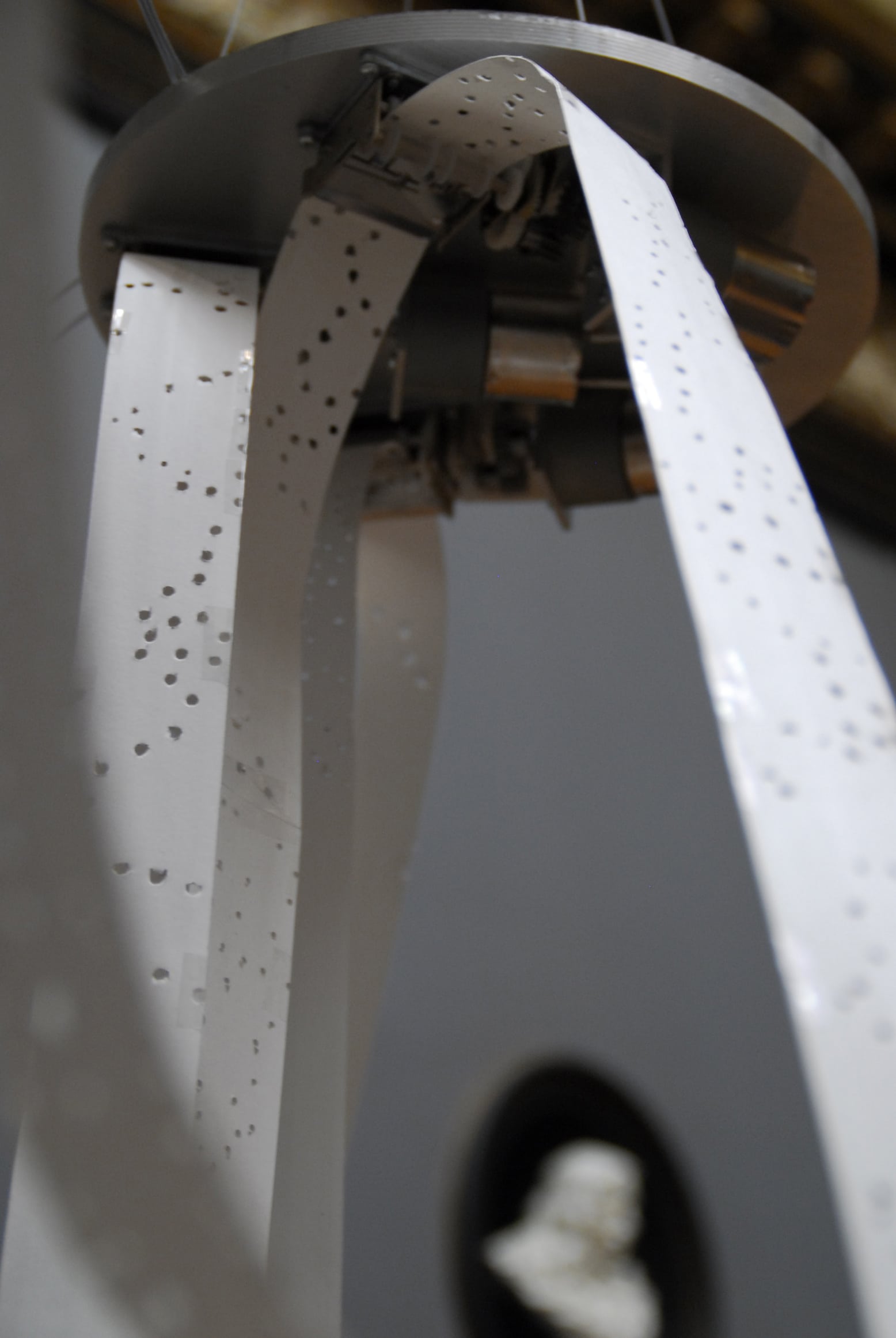 The starting point for the programming of these punched tapes is a literal translation of Pieter Bruegel the Elder’s “The Tower of Babel” (1563). In 1725, the French inventor Basile Bouchon developed the technology of punched tapes. He used punched tapes to “programme” patterns for looms. Without having to physically convert the looms, he achieved myriad results. This is also an essential aspect of computers. However, Biederman turns the representational relationship upside down. The image is the basis for the melodious sounds.