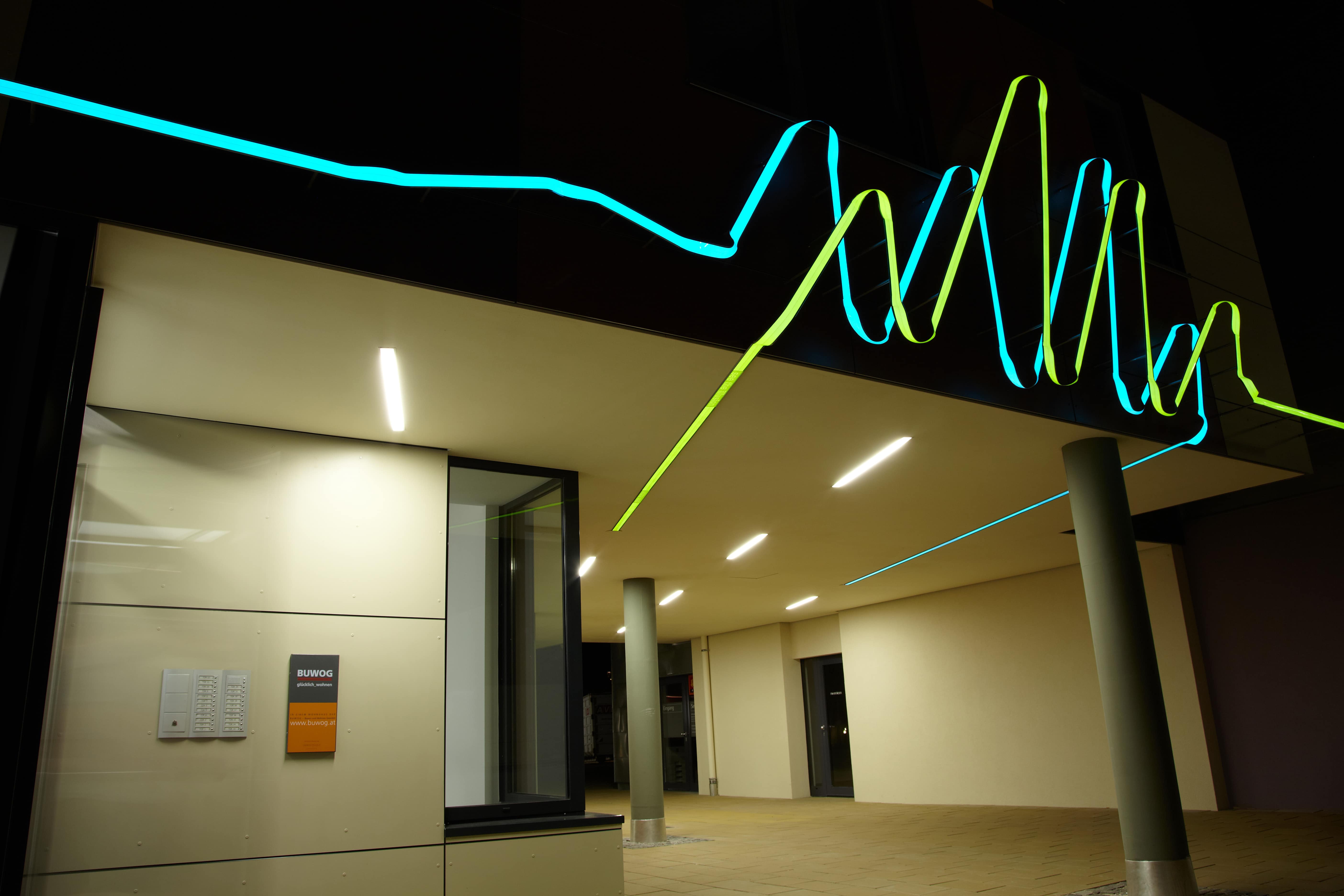 Biedermann has succeeded in creating a three-dimensional language code by way of light bands at the entrances and through-paths of this new residential complex in Vienna. This installation is ought to represent a sign post, but may also serve as identification of this residential location. The light bands are used at heavily frequented passages of the building and, hence, serve as a kind of guide system – before, these bands have been used, for example, in airplanes to indicate orientation. According to Friedrich Biedermann, “Intensifications Matrix” are forms, which tend to create a feeling of a floating movement at the building, a steadily recurring rhythm at one particular point!“